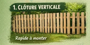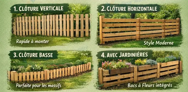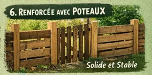 – Principe : Les palettes sont fixées verticalement, côte à côte, pour former une barrière simple et efficace.